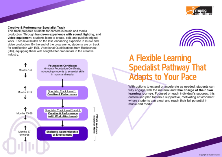For students needing extra support, the programme offers a continued apprenticeship with Music Solutions, providing a safe, nurturing environment to work and learn under close supervision. This structured approach empowers students to grow professionally at their own pace – ensuring they’re ready for the job market without facing its full challenges right away.