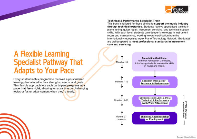 This track is tailored for those aiming to support the music industry through technical expertise. Students receive specialised training in piano tuning, guitar repair, instrument servicing, and technical support skills. With each level, students gain deeper knowledge in instrument repair and maintenance, working toward certification from the internationally recognised Apex Piano Technology Network. Graduates are well-prepared to meet professional standards in instrument care and servicing.